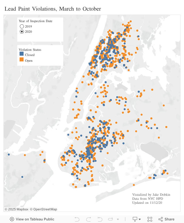 That picture remains unclear—again, the Health Department did not answer a detailed list of questions—and there is no public database of orders that the Health Department issues to landlords to conduct lead-abatement work. But the agency shares responsibility for enforcing those laws with the Department of Housing Preservation and Development, which has seen a nearly 60 percent drop in the number of lead-paint violations issued between late March and the end of October compared to the same period last year, according to an analysis by WNYC/Gothamist.